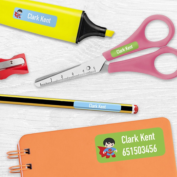 Namensaufkleber für kinder SuperMan. Kit von anpassbaren Aufklebern, um die Bücher der Kinderschule mit ihren Namen zu markieren, mit der Zeichnung von SuperMan. Es enthält verschiedene Größen und Etiketten in verschiedenen Farben. Vermeiden Sie es, Bücher, Bleistifte oder Schulhefte zu verlieren. Es gibt 16 Aufkleber von 50x7 mm, 20 von 50x12 mm, 12 von 50x20 mm, 24 von 30x7 mm, 4 von 50x50 mm runde Form und 4 von 50x50 mm Quadrat.