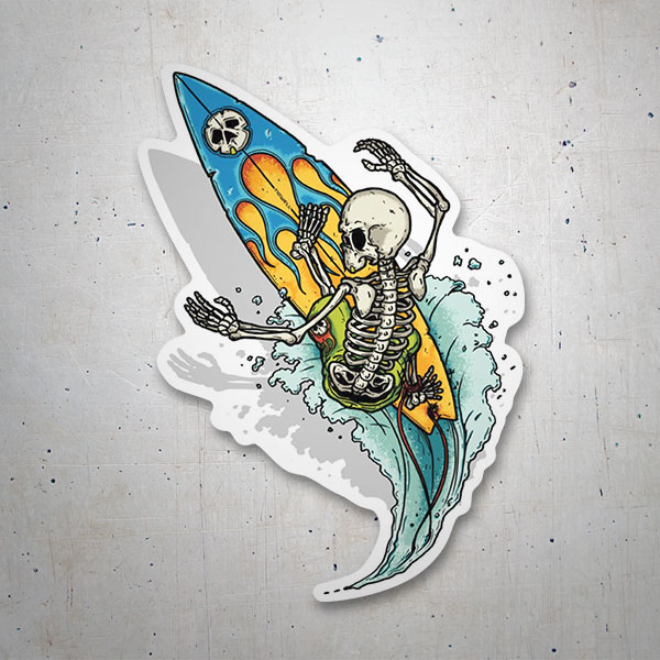 Aufkleber Skelett-Surfen. Lebendige Aufkleber-Illustration eines Skeletts, das auf einem blauen Brett mit brennenden Fackeln auf einer Welle surft. Ein ideales Design, um Ihre Leidenschaft für das Surfen zu zeigen. Holen Sie sich diesen Aufkleber und verzieren Sie Ihre Lieblingsoberfläche.