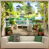 Ein romantischer Ausblick, der Herzen höher schlagen lässt. Diese verträumte Fototapete See der Liebe zeigt den Blick von einer blumengeschmückten Terrasse auf einen idyllischen See. Schwäne gleiten über das Wasser, ein Springbrunnen plätschert leise und im Hintergrund spannt sich eine malerische Brücke. Dieses Motiv ist erfüllt von Romantik und Harmonie und eignet sich perfekt, um im Schlaf- oder Wohnzimmer eine liebevolle und friedliche Atmosphäre zu schaffen.