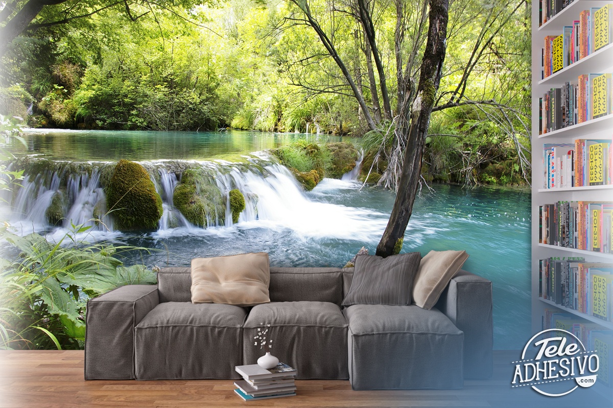 Fototapeten: Vegetation und Fluss mit Wasserfall