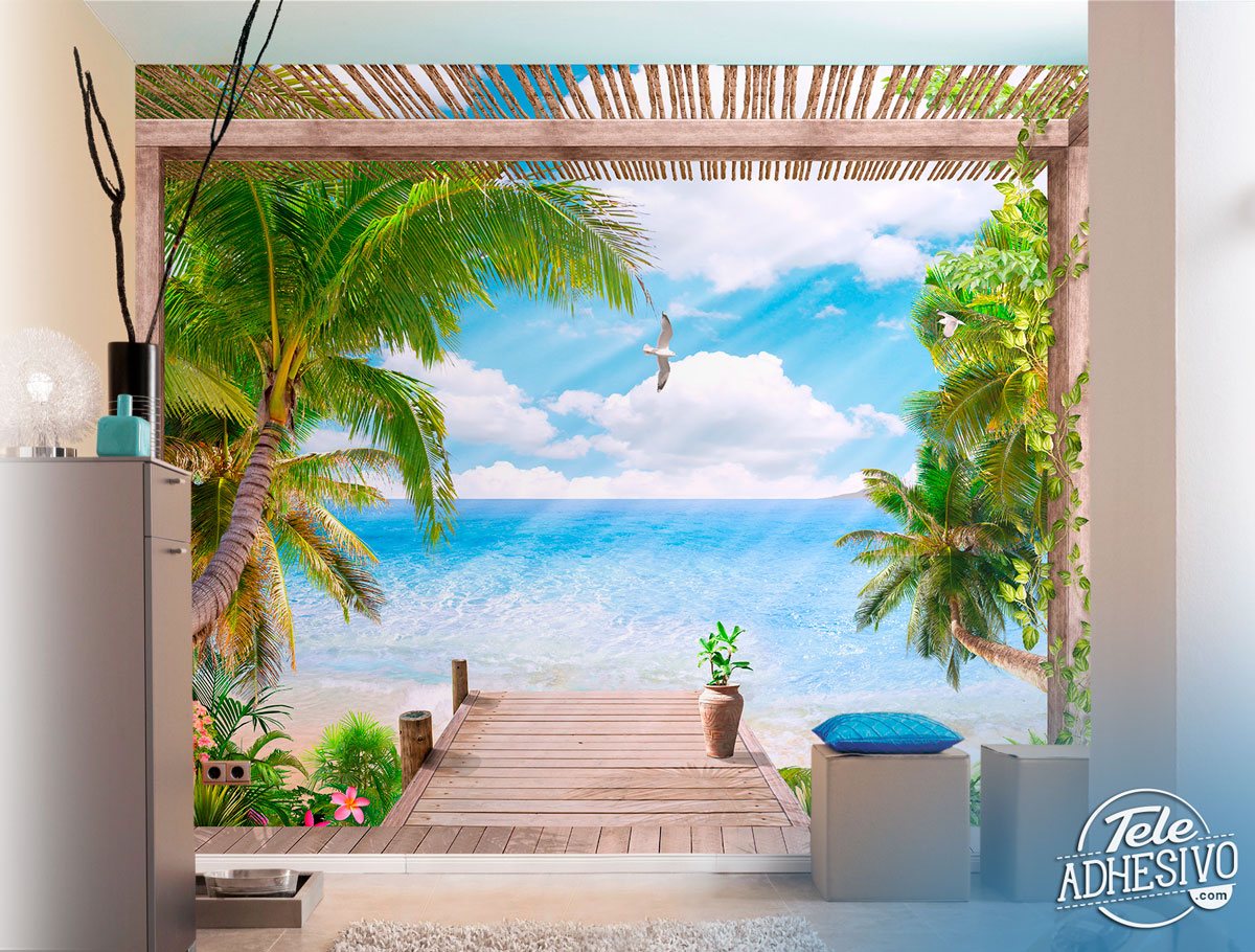 Genießen Sie den Ausblick von Ihrer eigenen Fototapete Veranda am Meer. Das Design schafft die perfekte Illusion einer gemütlichen Holzterrasse mit direktem Zugang zum Strand. Weiche Kissen laden zum Verweilen ein, während der Blick über das endlose blaue Meer schweift. Palmen und eine leichte Brise vervollständigen das Gefühl von Urlaub und Entspannung. Diese Meerblick-Fototapete eignet sich hervorragend, um im Wohnzimmer eine entspannte und einladende Atmosphäre im Strandhaus-Stil zu schaffen.