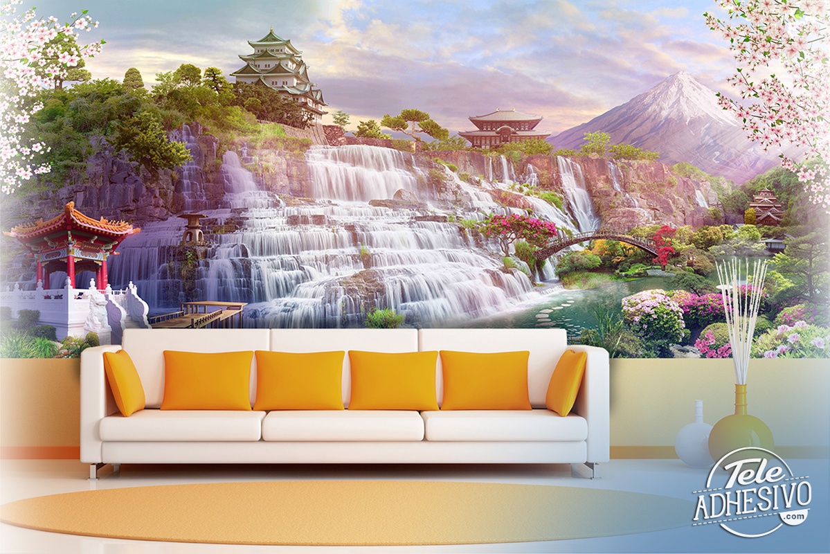 Fototapete Wasserfall Japan. Panoramabild einiger japanischer Tempel auf eine Steigung, von der ein schöner Wasserfall fällt. Eine Brücke überquert den Fluss voller schöner Blumen. Der Fuji im Hintergrund hebt dieses Bild hervor. Ideal für Restaurants, Bars, Lounges und Schlafzimmer.