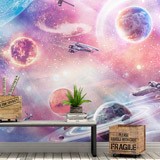 Fototapete Raum. Schönes und fantastisches Bild bestehend aus Planeten, Raumschiffen, Sternen und Sonnensystemen. In Lila- und Blautönen ein unglaubliches Raumbild. Der Weltraum bezieht sich auf die leeren Regionen des Universums außerhalb der Atmosphären von Himmelskörpern.