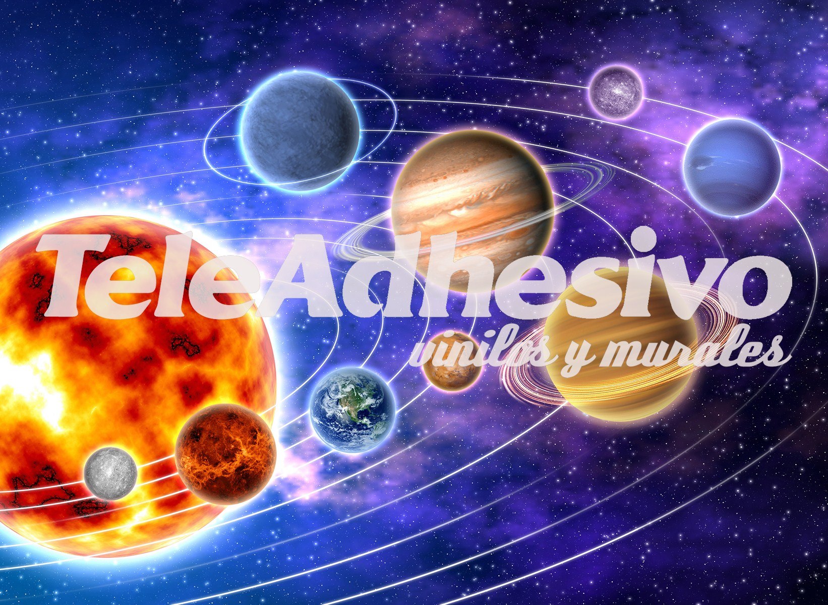 Fototapete Sonnensystem. Erholung unseres Planetensystems, in dem die acht Planeten und ein Zwergplanet (Pluto) beschrieben sind, sowie ihre Umlaufbahnen um die Sonne. Zusätzlich zu diesen Planeten beherbergt dieses System von 4568 Millionen Jahren 5 Zwergplaneten und 400 natürliche Satelliten