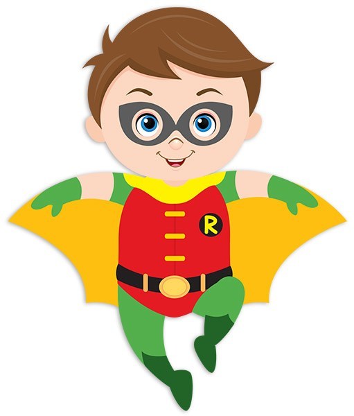 Wandtattoo kinder Robin fliegt. Lustige Zeichnung des jungen Gefährten von Batman, Superheld von DC Comics seit 1940. Robin zeichnet sich dadurch aus, dass er fröhlich und positiv ist, sein Heldenkostüm ist sehr bunt und auffällig. Dekoriere die Zimmer deiner Kinder so, dass sie sich wie echte Helden anfühlen.