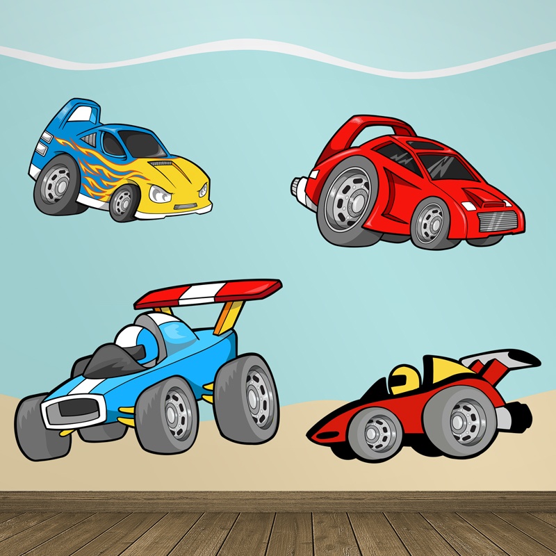 Wandtattoo kinder Schnelle Autos. Karikierte Zeichnungen von Rennwagen wie Dragster und Formel 1 sind die schnellsten Autos. Der Bausatz besteht aus vier Autos, zwei roten, einem blauen und einem blauen und einem gelben. Ideal, um den Raum der Kleinen des Hauses zu dekorieren.