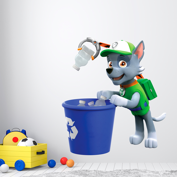 Vinyl für Kinder von Rocky der Paw Patrol, es ist ein Welpe Mestizen, Umweltschützer und Recycler der Gruppe. Bei dieser Gelegenheit sehen wir als recycling-Flaschen in die entsprechenden Container. Er weiß immer, wie man die Probleme zu beheben, und seinen Kran zu Scherben aufzusammeln und für tausend verschiedene Dinge verwenden.