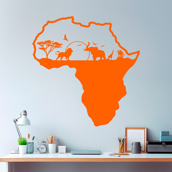 Die ganze Essenz des afrikanischen Kontinents auf diesem Wandtattoo. Eine Silhouette von Afrika als Rahmen einer schönen Landschaft der afrikanischen Savanne. Die repräsentativsten Tiere, der Löwe, der Elefant, die Giraffe, die Geparden, die Vögel und ein typischer Baum (Akazie) und im Hintergrund ein außergewöhnlicher Sonnenuntergang. Ein exklusives Design.