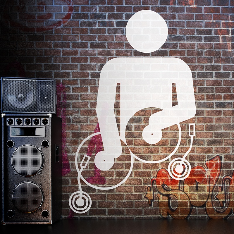 Wandtattoo Tocadiscs beim Spielen. Design für Liebhaber von musikalischem Vinyl, bei dem wir sehen, wie die Nadel in der Mitte der Platte klingt. Ein Plattenspieler ist ein Tonwiedergabesystem vom analogen elektromechanischen Typ, das den Phonographenzylinder durch eine Scheibe ersetzt.