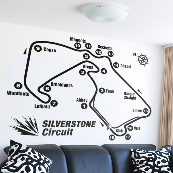 Wandtattoo Silverstone Rennstrecke. Entwurf einer der prestigeträchtigsten Rennstrecke Europas, deren ursprüngliches Layout die Landebahnen des alten Flughafens verwendet. Im Jahr 2010 wurde es modifiziert und die verschiedenen Meisterschaften werden in vielen Kategorien von Autos und Motorrädern ausgetragen.