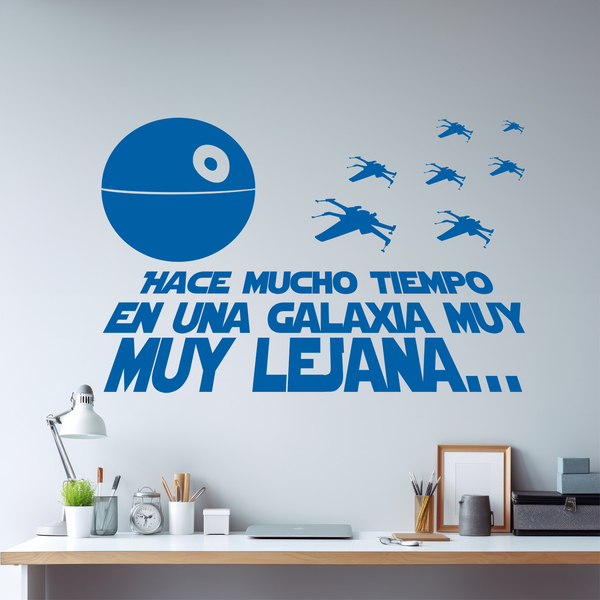 Wandtattoo Hollywood Ferne Galaxie. Design mit spanischem Text. "Vor langer Zeit, in einer Galaxie weit weg.... "Bist du ein Star Wars-Fan?" Der mythische Satz, mit dem dieser Film beginnt, darf in deinem Haus nicht fehlen. Filme, die von dem Filmemacher George Lucas konzipiert wurden.