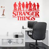 Wandtattoo Silhouetten stranger things. Design mit dem Kopf der Serie und den Silhouetten der Hauptfiguren der Serie, die in den 80er Jahren in einem Dorf in den Vereinigten Staaten spielt, wird der junge Will Byers verschwinden und diese Tatsache deckt seltsame Ereignisse auf, die sich in einem so mysteriösen Dorf abspielen.