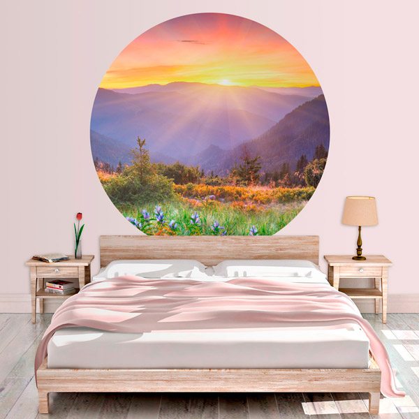 Rund wandtatto Sonnenuntergang in den Bergen. Unglaubliche kreisförmige dekorative Vinyl einer charmanten Berglandschaft, wo man den Sonnenuntergang am Horizont sehen kann. Dieser wunderschöne Aufkleber aus selbstklebendem Vinyl ist in verschiedenen Größen und dekorativen Ausführungen erhältlich.