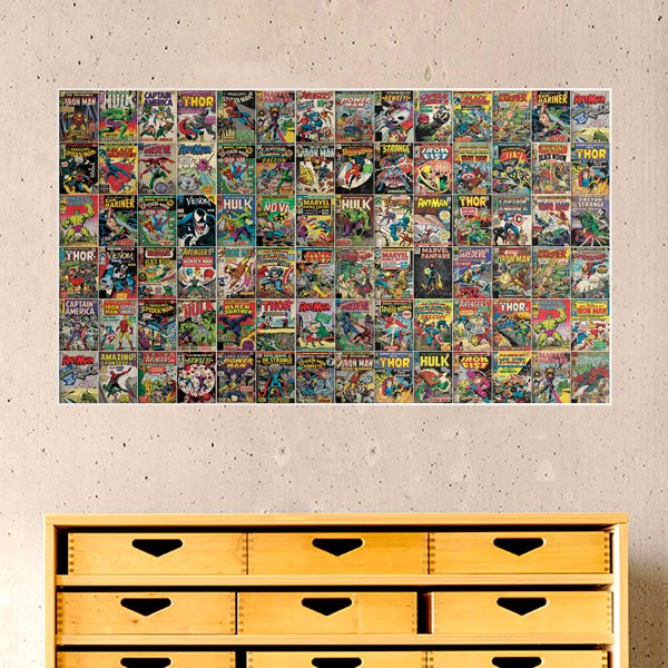 Fototapete Avengers Comic. Der Avengers-Comic-Strip mit dem Text in Englisch und voller Farbe, in dem eine Geschichte mit Charakteren wie Spiderman, Hulk, Iron Man, Thor und Captain America erscheint. Wenn Sie ein Fan von Comics und Marvel sind, werden Sie dieses Design in Ihrem Haus platzieren wollen.