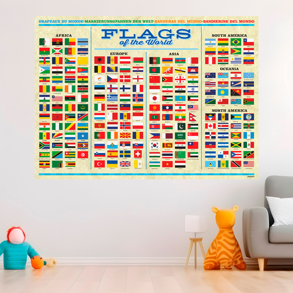 Selbstklebendes Poster Flaggen der Welt. Dieses selbstklebende Poster enthält alle Flaggen der Welt. Ideal für jede Schule, Hochschule oder Institution. Es wird auch für unsere Kinder nützlich sein, sich das richtige Wissen zu diesem Thema anzueignen: Dekorieren Sie, während Sie lernen!
