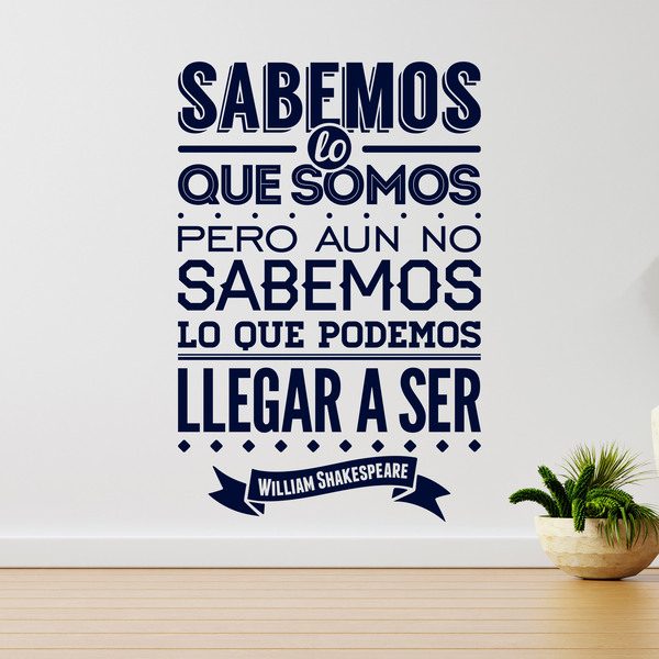 Wandtattoo Sabemos lo que somos... William Shakespeare. Motivierende Phrase von William Shakespeare, war ein Dramatiker, ein Dichter und ein englischer Schauspieler. Mit dem Satz auf Spanisch: Wir wissen, was wir sind, aber wir wissen immer noch nicht, was wir werden können.